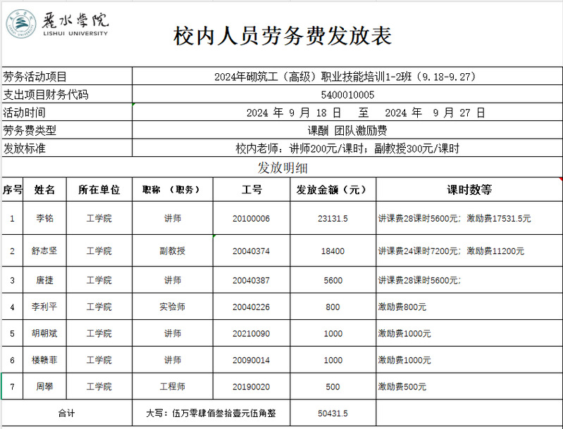 2024年砌筑工(高级)职业技能培训1-2班(9.18-9.27)校内劳务费公示