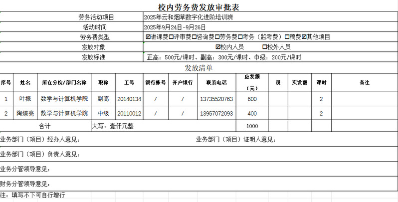2025年云和烟草数字化进阶培训班校内劳务费发放公示