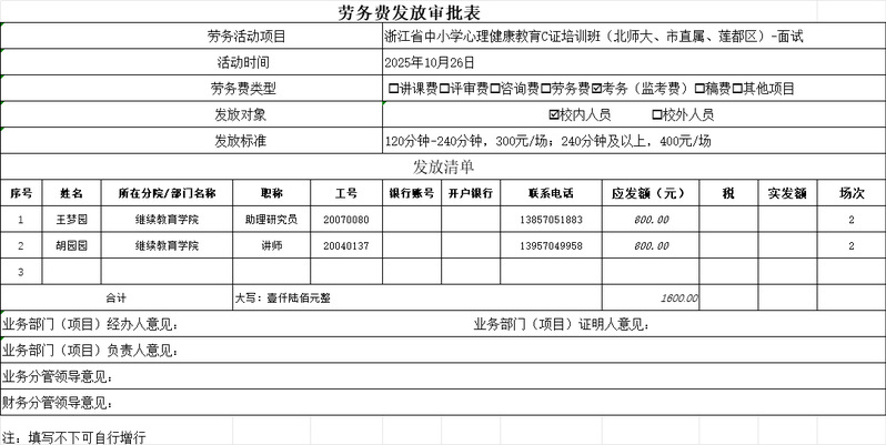 浙江省中小学心理健康教育c证培训班(北师大、市直属、莲都区)——面试校内劳务费发放公示