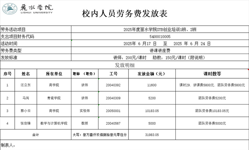 2025年度丽水学院SYB创业培训1班、2班校内劳务费发放公示