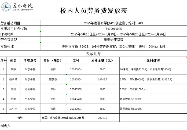 2025年度丽水学院GYB创业意识培训1-4班校内劳务费发放公示