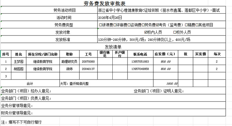 浙江省中小学心理健康教育C证培训班(丽水市直属、莲都区中小学)-面试校内劳务费公式