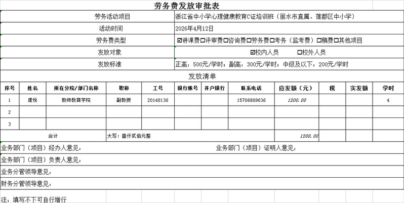 浙江中小学心理健康教育C证培训班(丽水市直属、莲都区中小学)校内劳务费公示